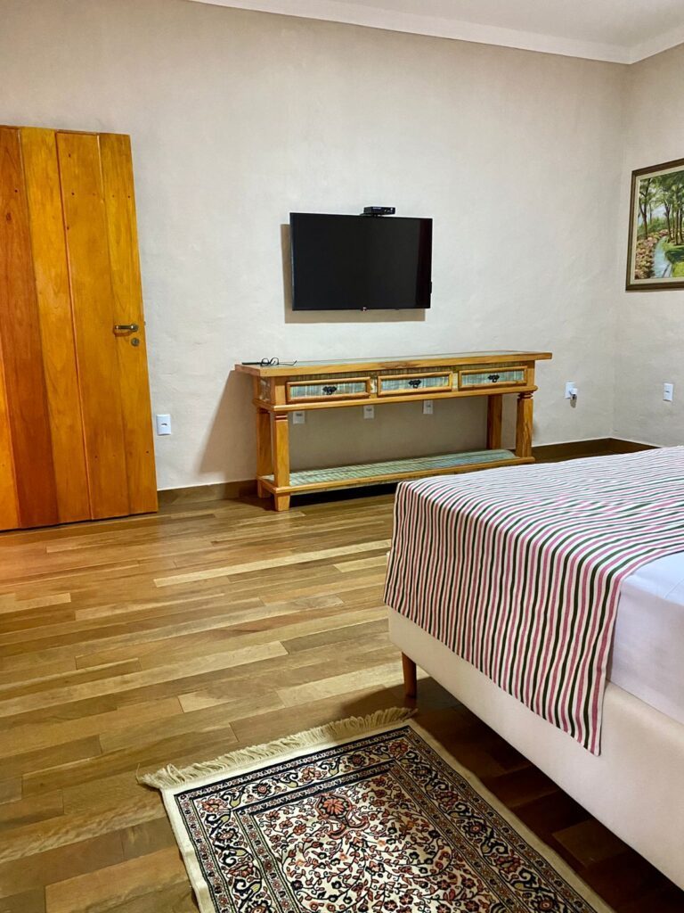 Composto por: 2 suítes - 1 suíte com cama super King - banheiro com banheira de hidromassagem - ar condicionado e Televisão - 2 camas de Solteiro com camas extras - banheiro amplo - ar condicionado e TV - sala com sofá , área coberta com lareira - piscina privativa - Ofurô - Comportam até 6 pessoas!