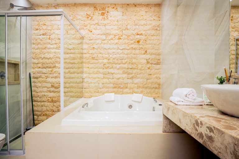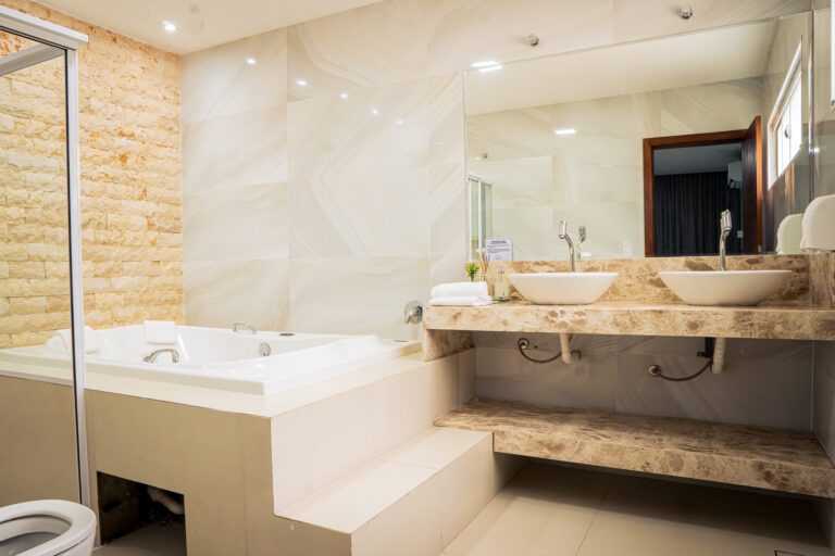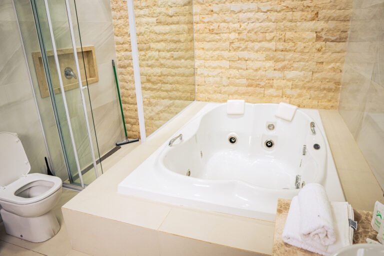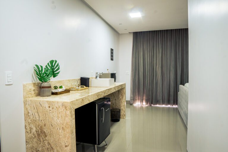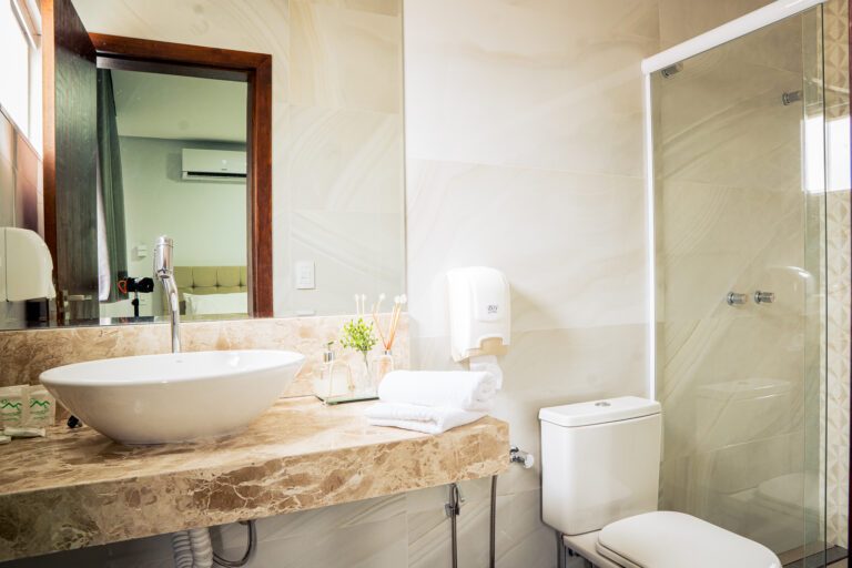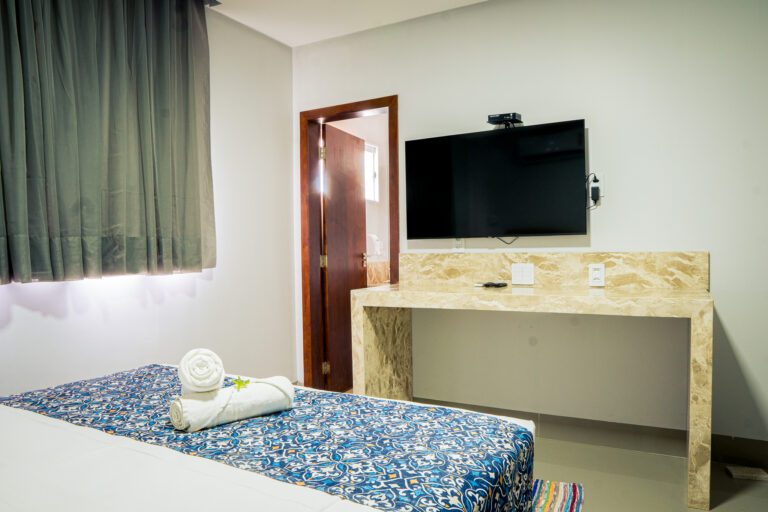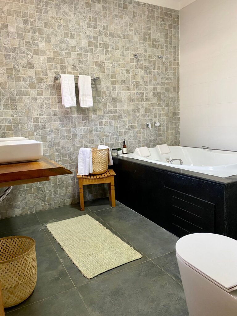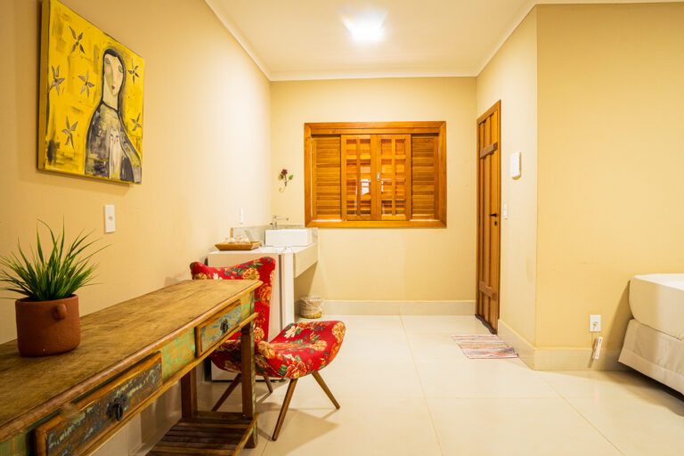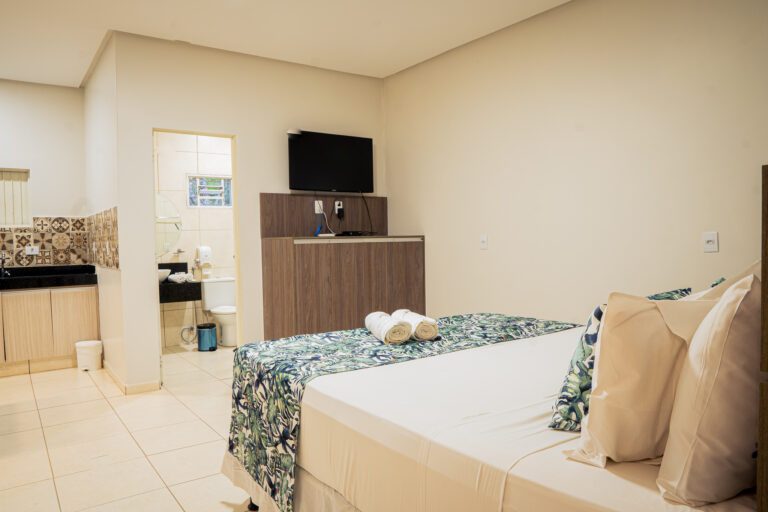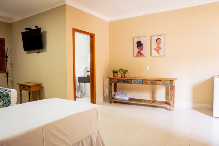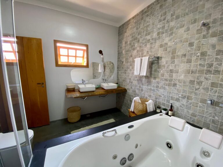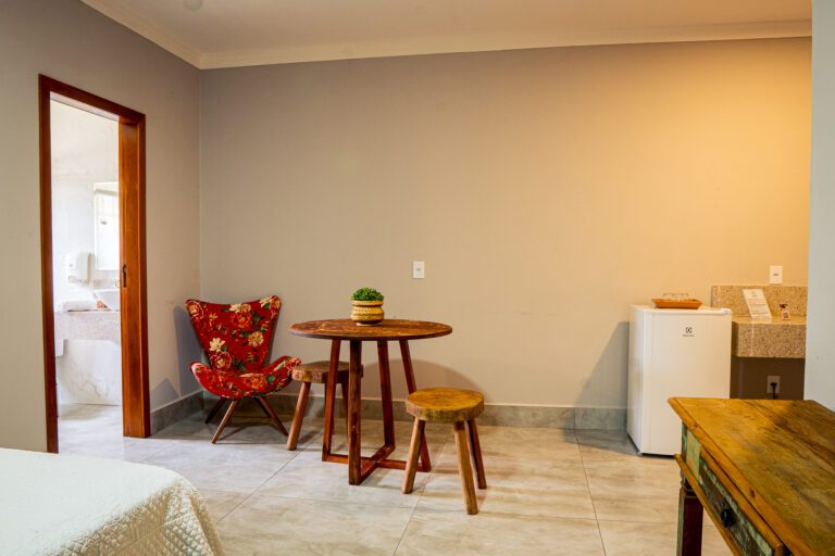Quarto aconchegante com cama King SizeBanheira de hidromassagem para relaxamentoAr-condicionado e TV LEDMesa de apoio para 2 pessoas e internet gratuitoBanheiro exclusivo com duas duchasIluminação elegante com lustre decorativo